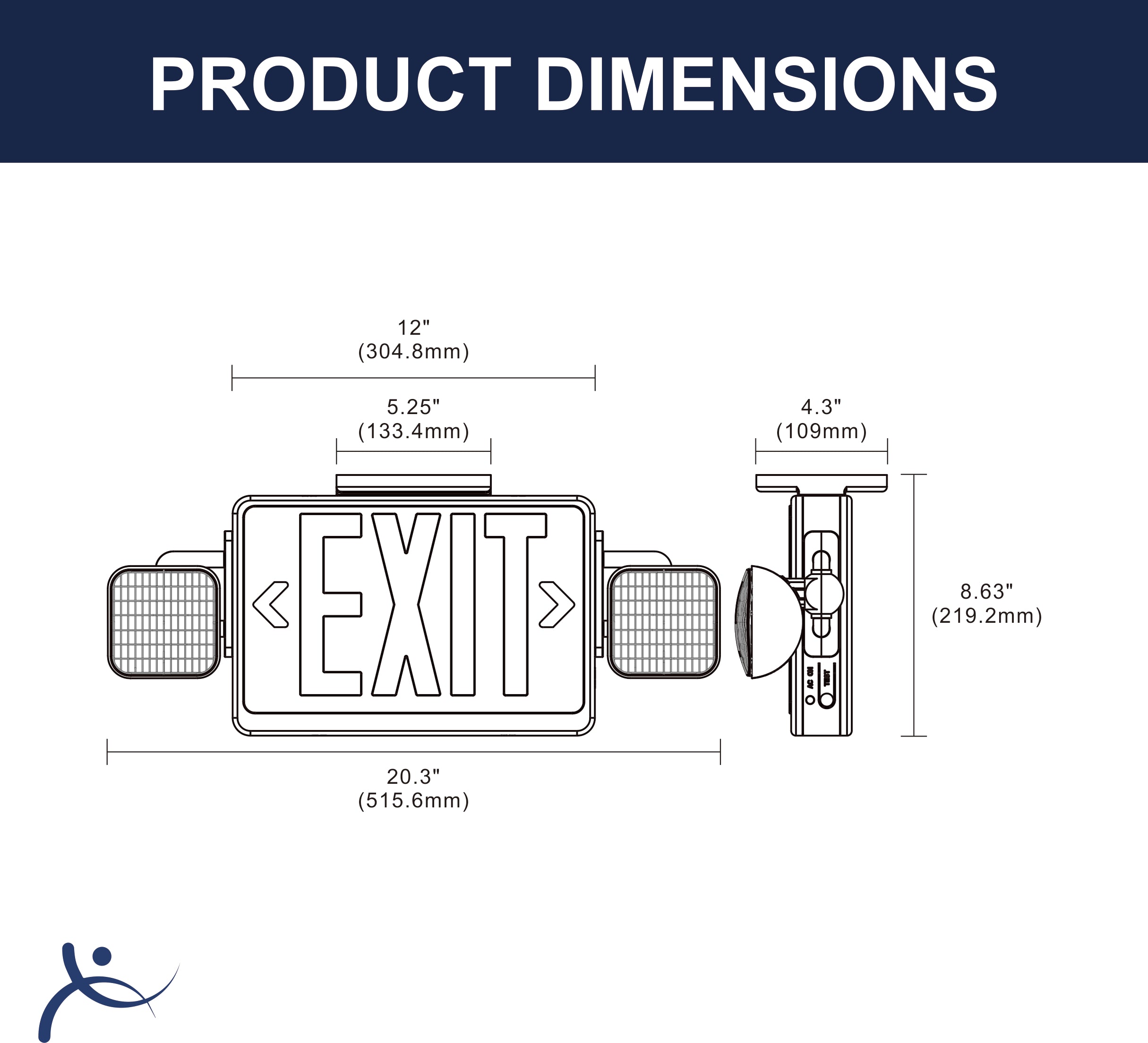 Industrial grade polycarbonate housing with dual voltage 100-120V and 220-277V. Field selectable for Green LED or Red LED. Nickel cadmium battery allow for min. 90 mins emergency illumination. Contractor friendly with "ON" LED for charge indicator as well as test switch. Option for Left and Right arrow knock out. Dual light on both sides provide high brightness in case of emergency.