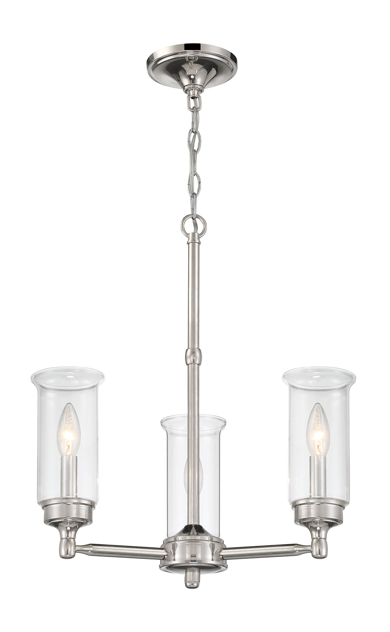 Beautiful clear candlelight shaped glasses surround satin nickel housing. With a variety of choices to choose from- from 1 light pendant to 3 light to 4 light circular to 5 light to 5 light island, this chandelier family provides great options for any decor.